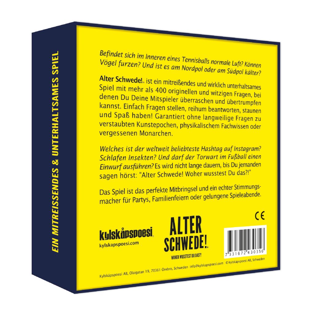 Alter Schwede! ist ein mitreißendes und wirklich unterhaltsames Spiel mit mehr als 400 originellen und witzigen Fragen, bei denen Du Deine Mitspieler überraschen und übertrumpfen kannst. Einfach Fragen stellen, reihum beantworten, staunen und Spaß haben! Garantiert ohne langweilige Fragen zu verstaubten Kunstepochen, physikalischem Fachwissen oder vergessenen Monarchen.