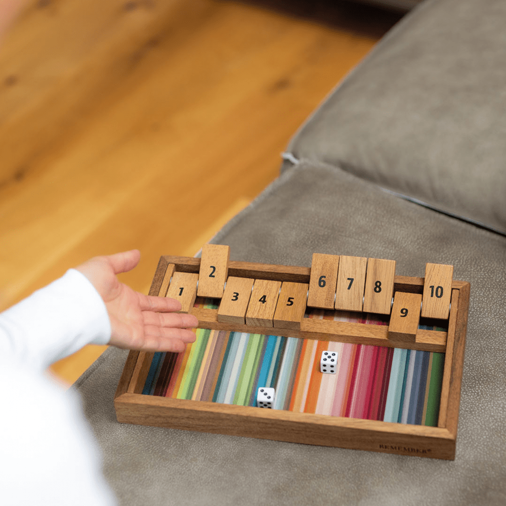 Schnelles Würfelspiel mit einfachen Regeln: Hier sind Würfelglück und Geschick gleichermaßen gefragt, denn jeder Spieler muss versuchen, möglichst viele der nummerierten Klappen der Box zu schließen. Wer alle Klappen schließen kann („Shut the box“), hat sofort gewonnen. Doch das ist nicht so einfach, wie es aussieht.