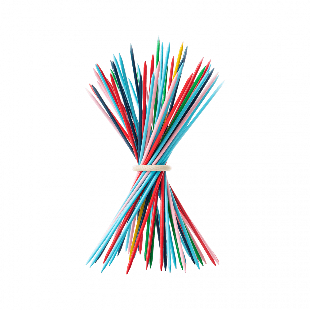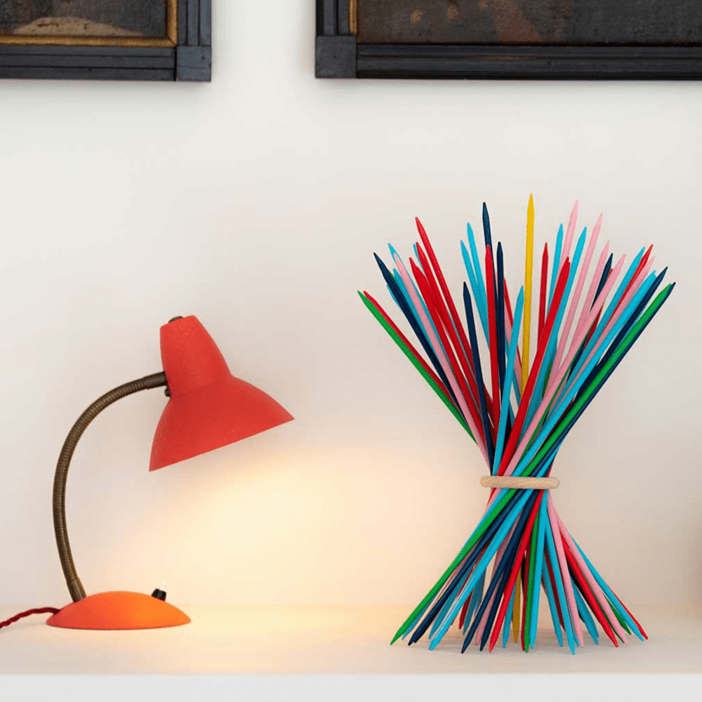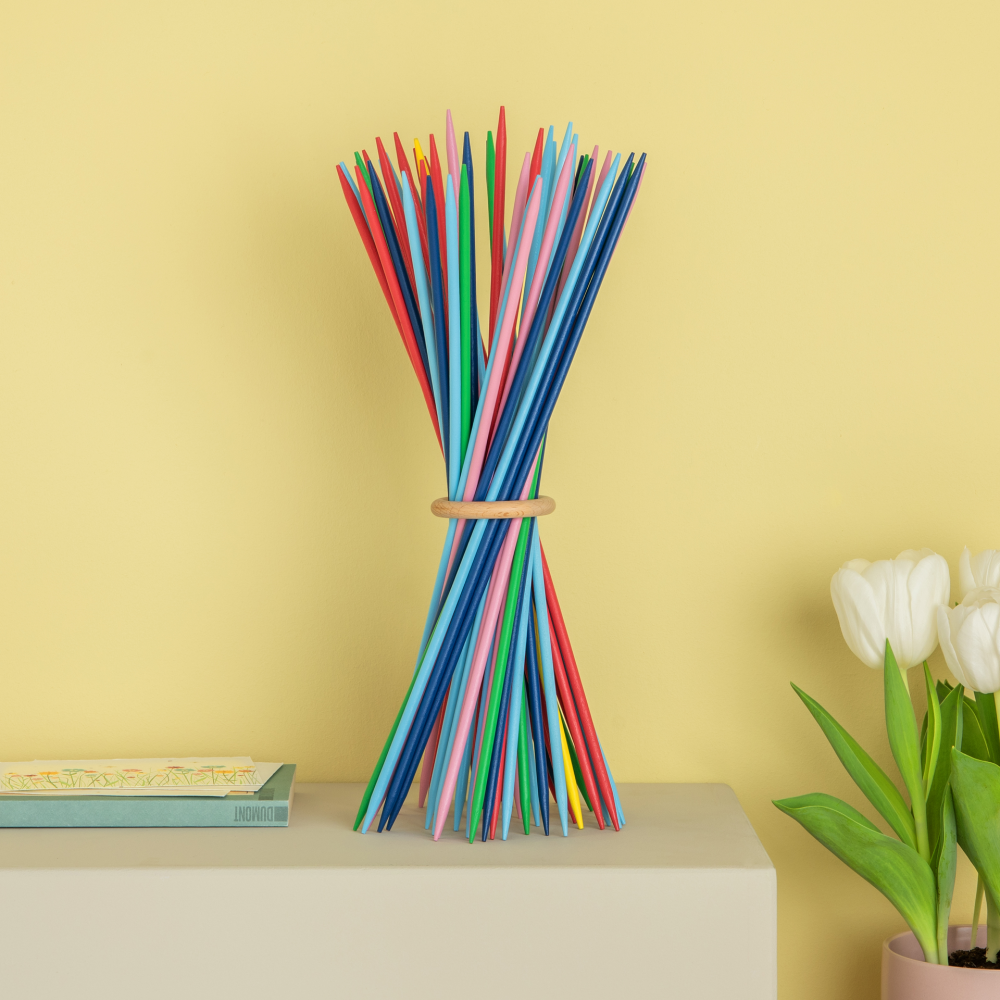 Ein Design-Objekt? Ein Spiel? Beides! Die 40 Zentimeter langen, farbigen Holzstäbe können mithilfe des Holzrings zu einem außergewöhnlichen Design-Objekt dekoriert werden. Ob in dieser Form zu einem bunten Strauß aufgestellt oder als klassisches Geschicklichkeitsspiel à la Mikado genutzt – hier kommen Design- und Spieleliebhaber gleichermaßen auf ihre Kosten.